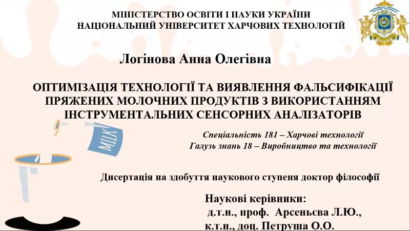 На кафедрі експертизи харчових продуктів запанувала творча наукова атмосфера – відбулося засідання міжкафедрального семінару, присвячене актуальним питанням контролю якості та виявлення фальсифікації пряженої молочної продукції. Захід став майданчиком для фахового обговорення результатів дисертаційного дослідження асистентки Анни Логінової на тему «Оптимізація технології та виявлення фальсифікації пряжених молочних продуктів з використанням інструментальних сенсорних аналізаторів». Робота підготовлена під науковим керівництвом професорки, д.т.н. Лариси Арсеньєвої та доцентки, к.т.н. Оксани Петруші.